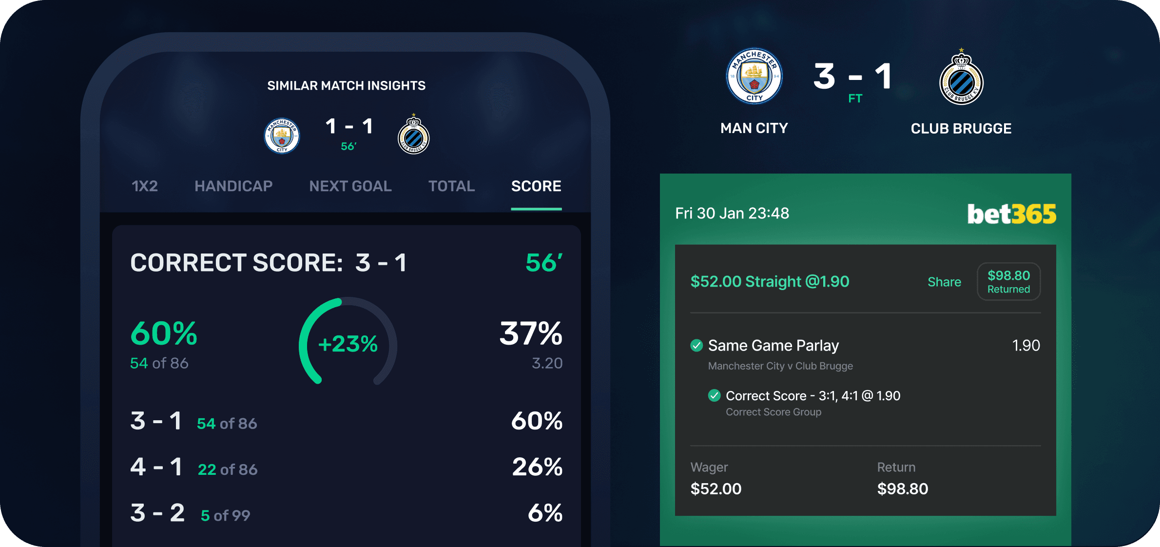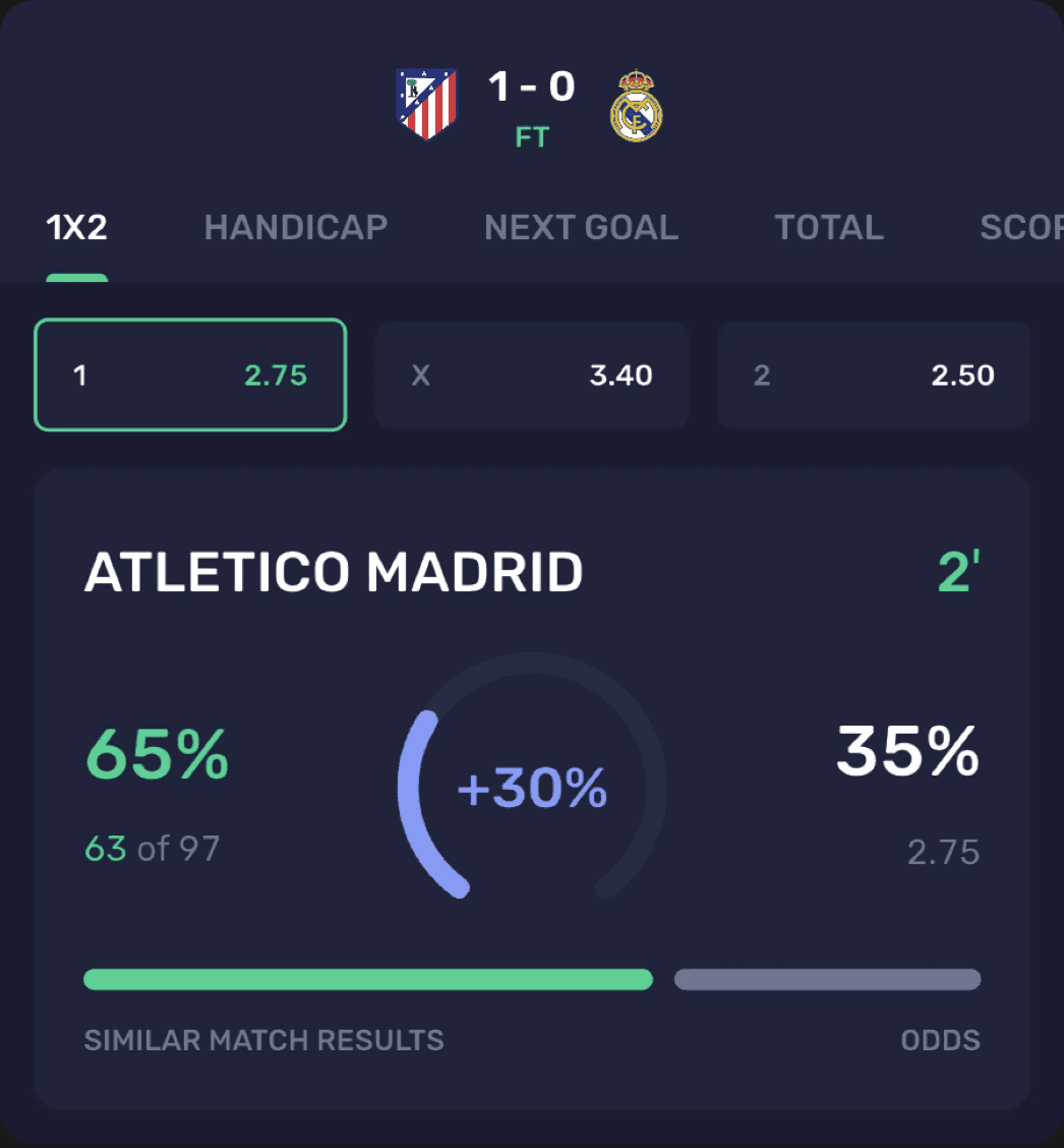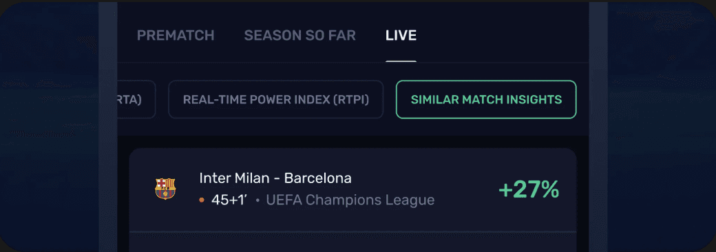 Similar Match Insights сompares probabilities based on similar matches with bookmaker odds. The percentage shows the difference from bookmaker odds.